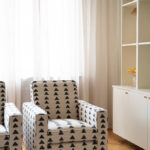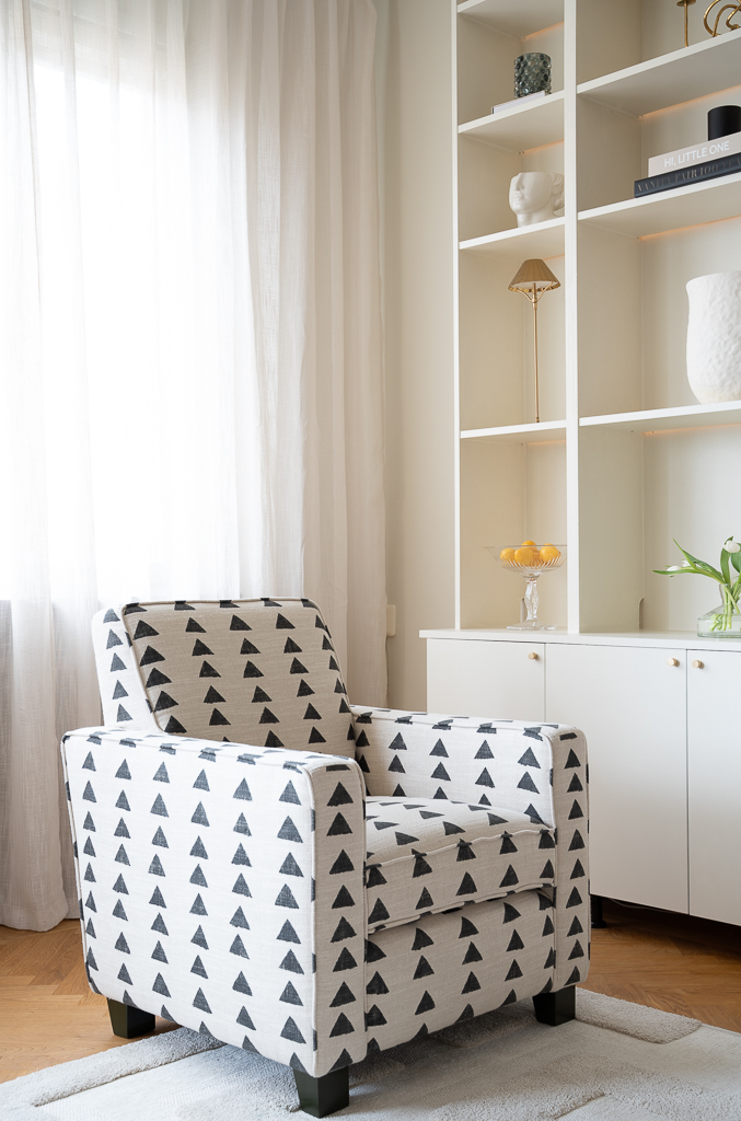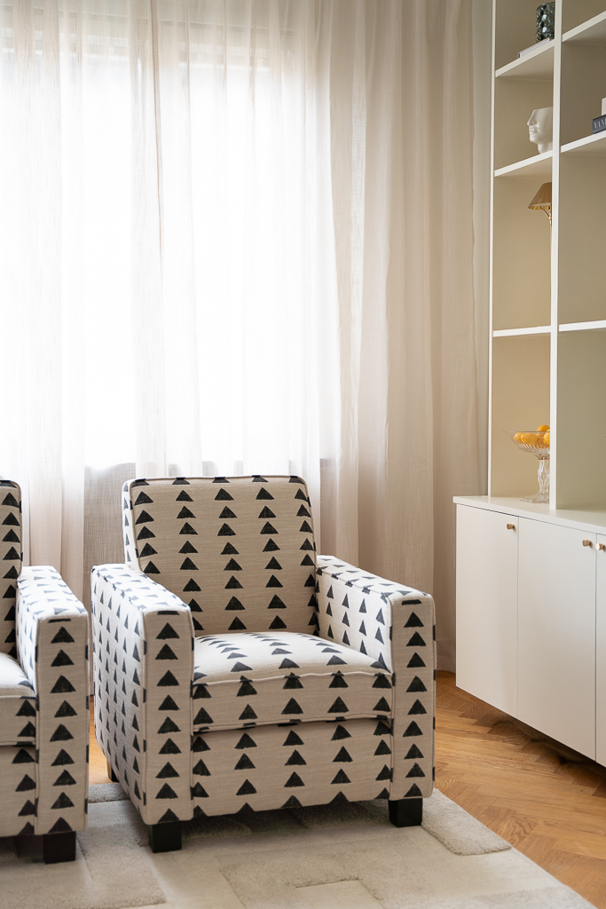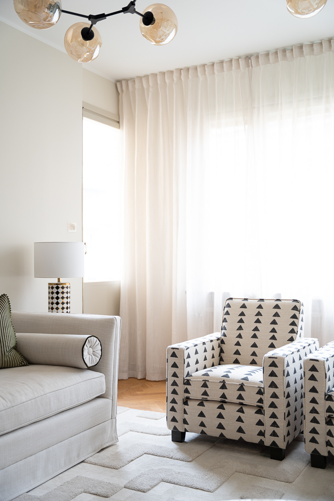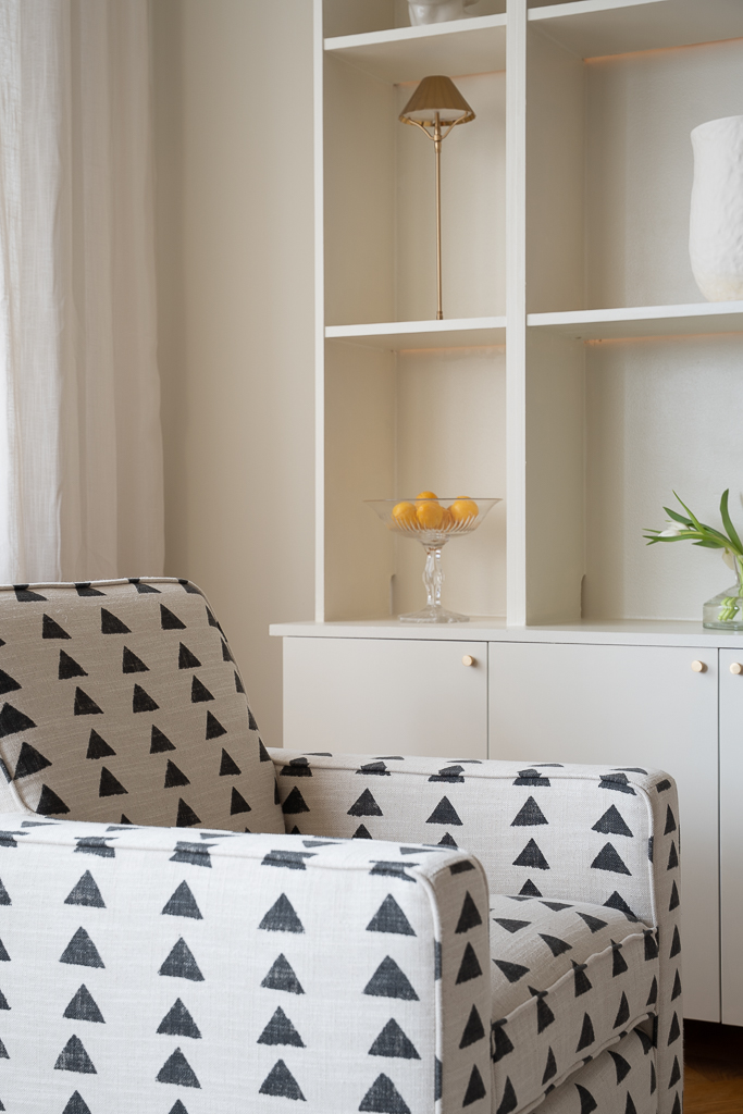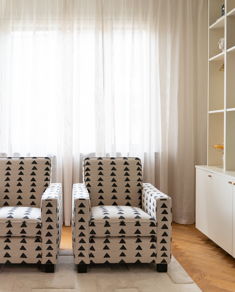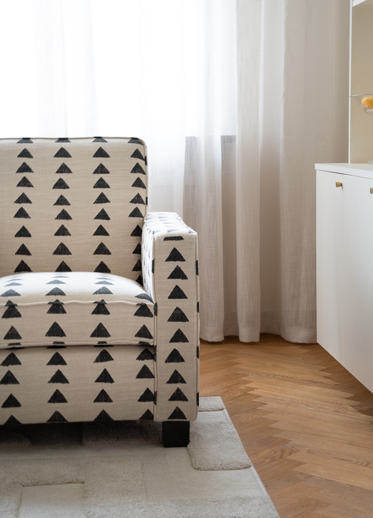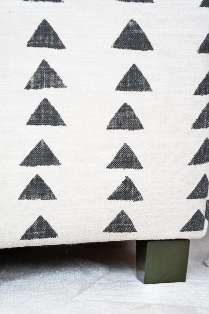Sleek lines with the comfort of a lounge chair. This chair is made for compact living with a strong sense of attitude. Perfect for both a modern home or a more traditional home as the lines are classic. The expression comes down to the choice of fabric and trims/piping. These club chairs work wonders in pair as it frames any space. Add a small side table in between for a styled look. We have upholstered this Caspian club chair in the geometric black and white "Boho Triangle" fabric. Is has a hand painted look and consists of 75 % cotton and 25 % linen. The legs on this chair have a bold dark green high gloss finish, but the choice of leg finish is yours. Made in EU.