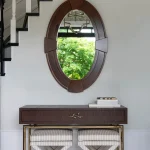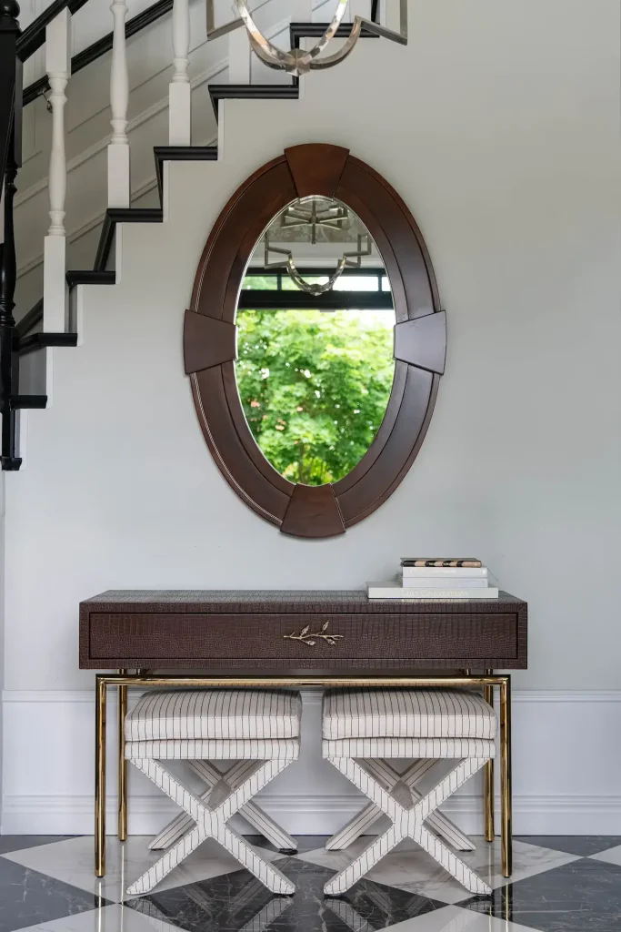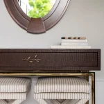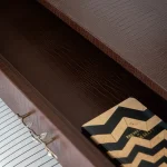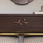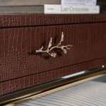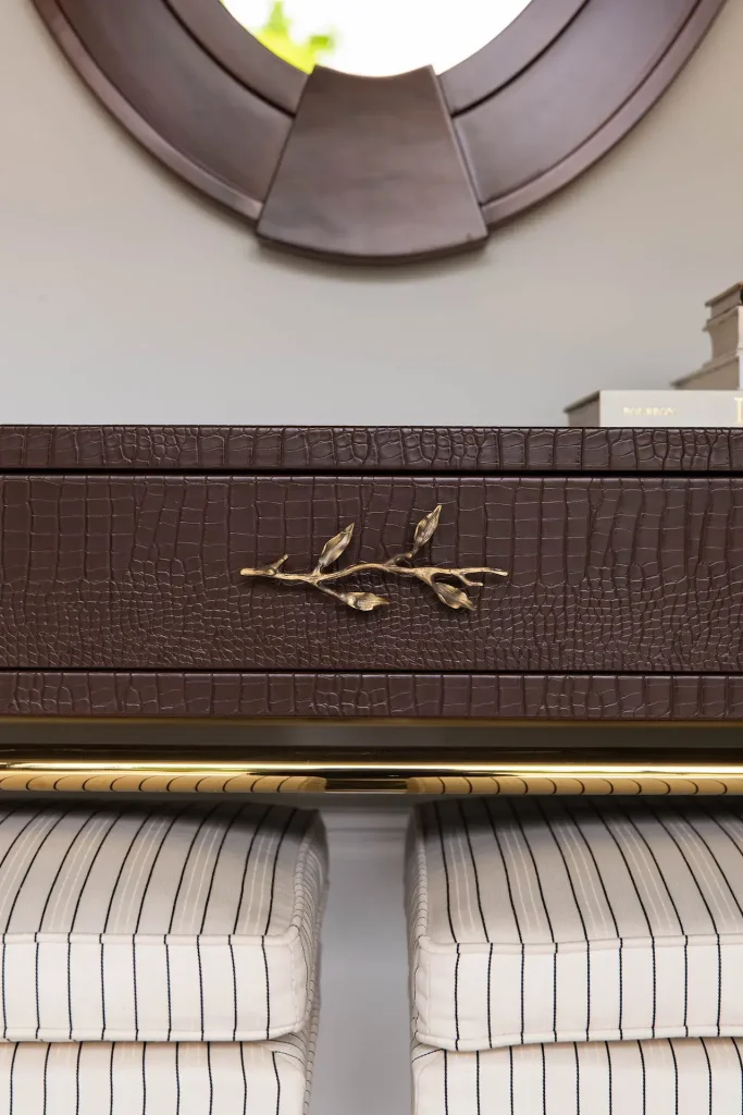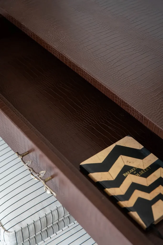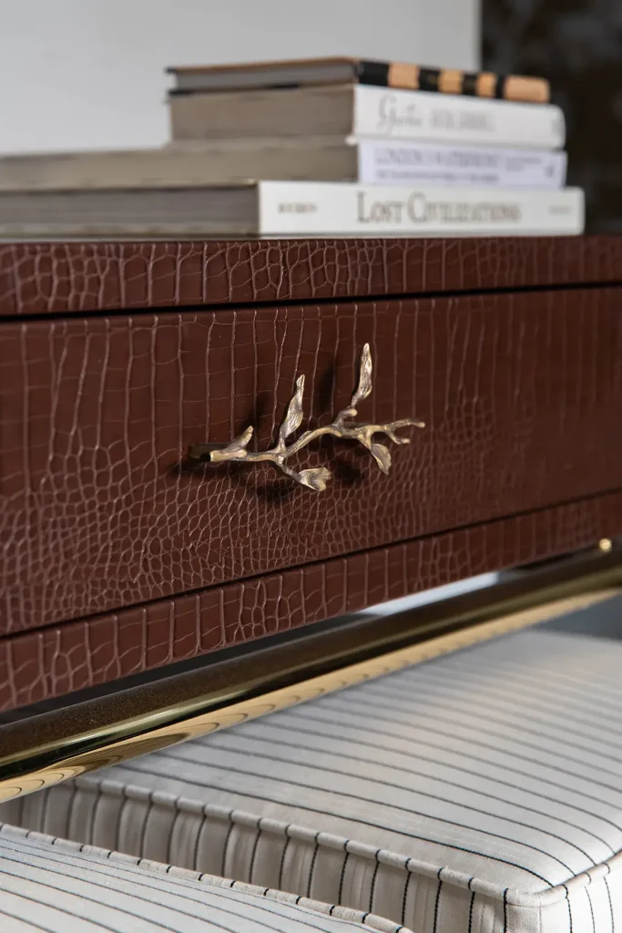 Bring sophistication and style to your home with our elegantly crafted Dylan Leather Desk. Wrapped in smooth vegan leather for a luxurious, eco-friendly finish, it features a spacious drawer accented by a beautiful handle in antique brass - an elegant nod to classic design. The sleek stainless steel legs, finished in radiant polished brass, provide a bold contrast and a touch of glamour, making it a statement piece in any setting. Designed for modern professionals who appreciate sustainable luxury, this desk is as practical as it is beautiful. Dylan comes in four variations of vegan leather; Chestnut Croco, Hunter Green Croco, Sang de Boeuf and Duck Egg.