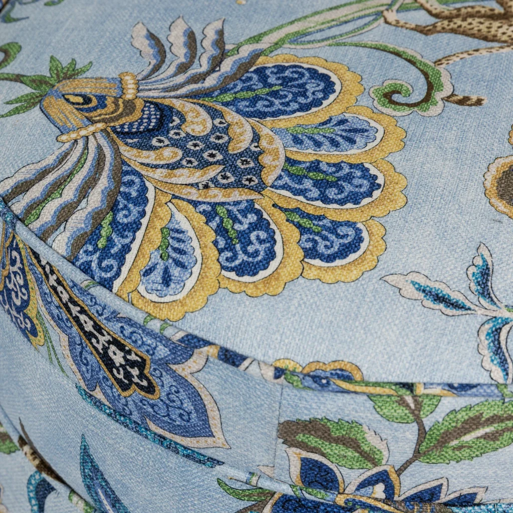 This piece is upholstered in "Adventurer - Caribe", a gorgeous cotton fabric with a large detailed pattern including flowers, leafs, peacocks and leopards.