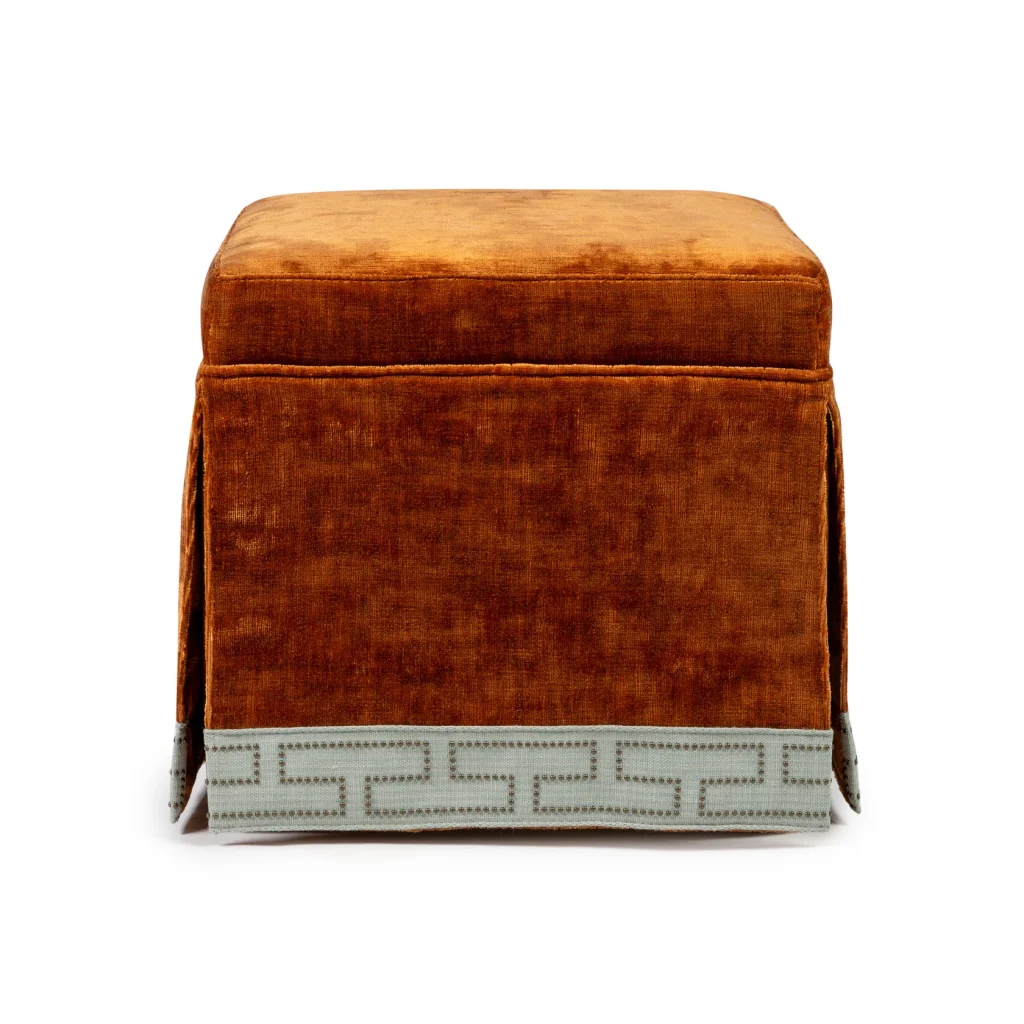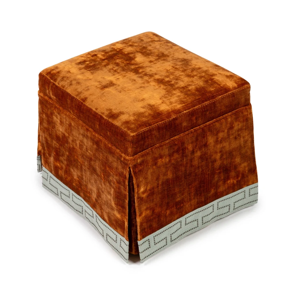 Introduce warmth, texture, and refined detail to your interior with this elegant square skirted pouf. Upholstered in luxurious velvet from Nobilis, its rich rust-toned hue brings depth and a soft luminous sheen that instantly elevates any space. The tailored skirt adds a classic, furniture-like presence, while the design is finished with a distinctive studded decorative border from Samuel & Sons. This beautifully crafted trim, with its subtle pattern and artisanal detailing, creates a striking contrast against the plush velvet and highlights the pouf’s refined craftsmanship. Versatile and sophisticated, this piece works effortlessly as a footrest, occasional seat, or accent table. Whether placed in a living room, bedroom, or dressing area, this square skirted pouf blends timeless elegance with modern luxury. An accent that feels both inviting and impeccably styled. Made in EU.
