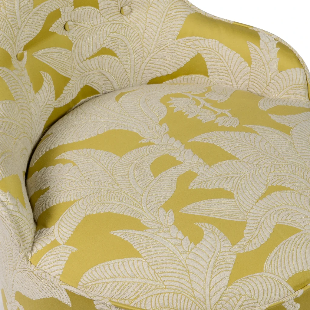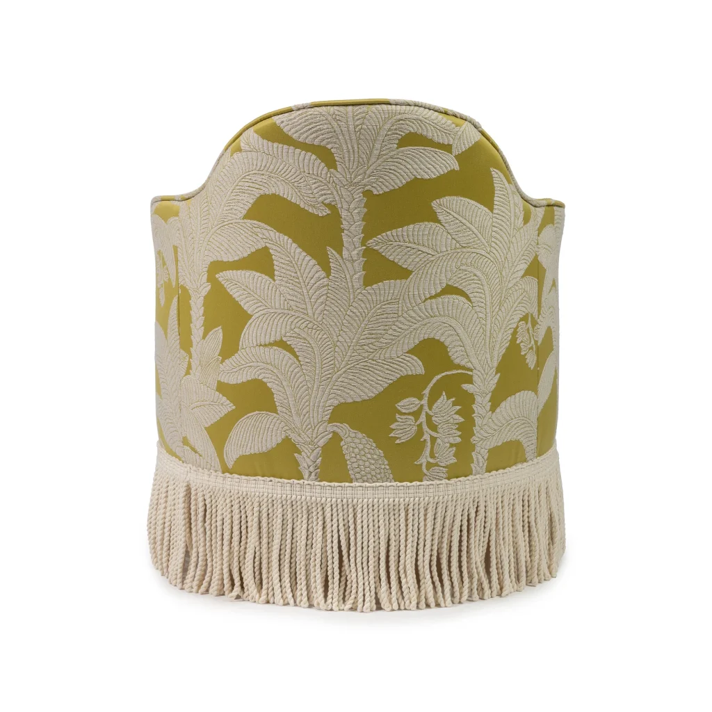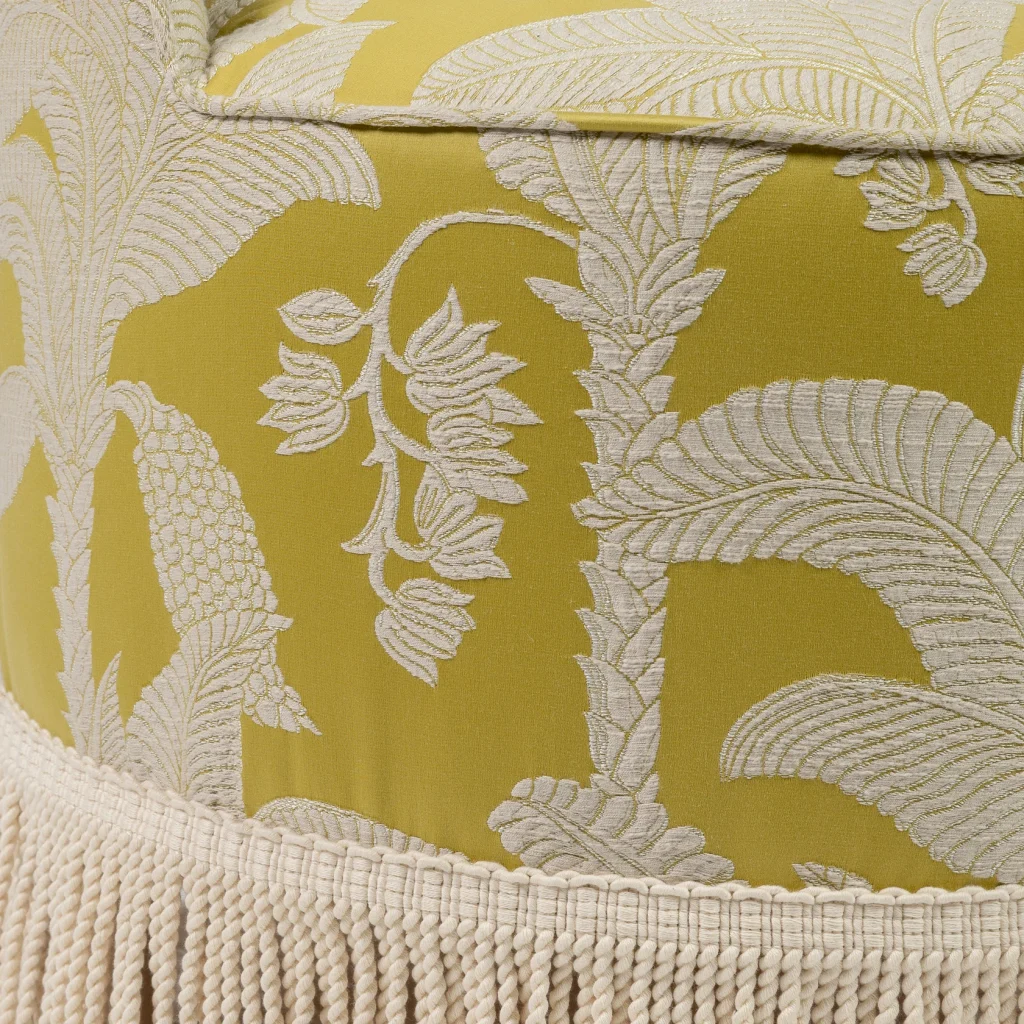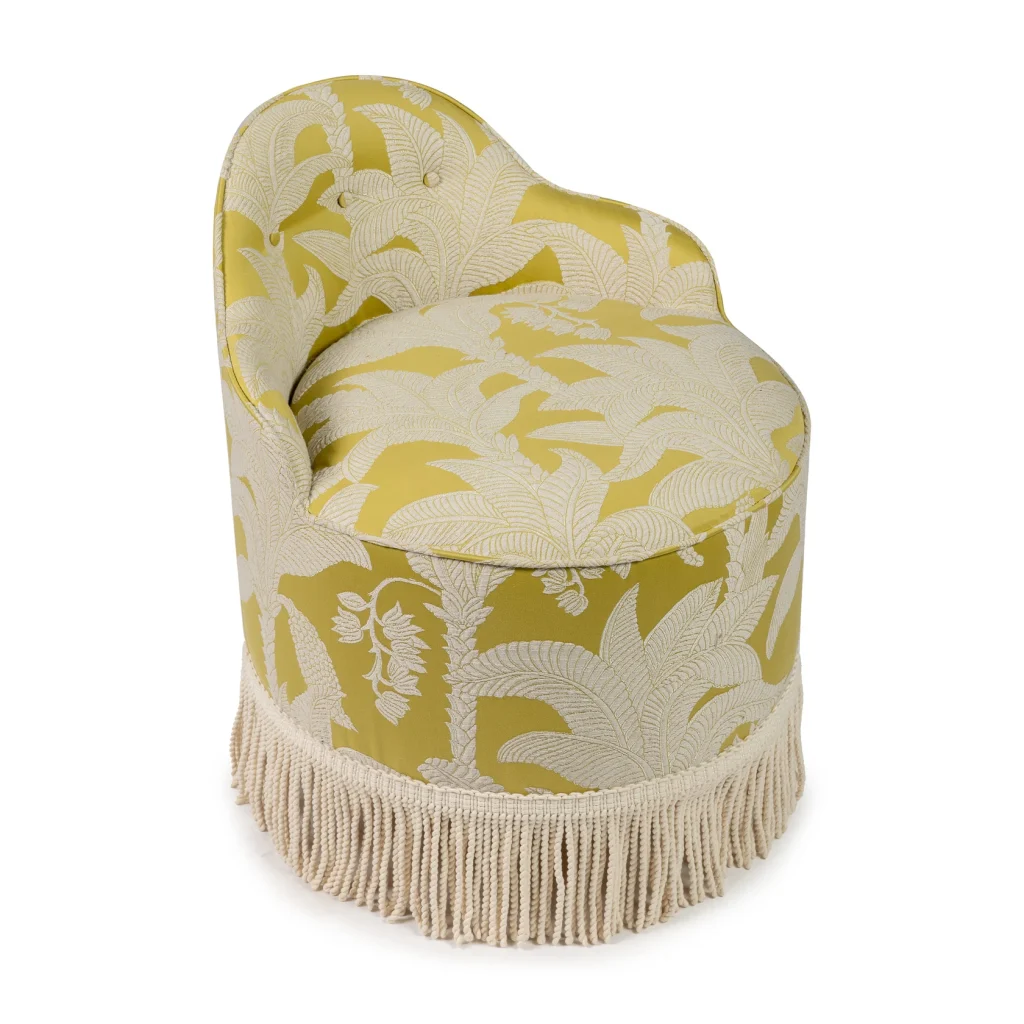 Bring out the Hollywood star in yourself! Our LOU vanity stool is an exquisite piece of furniture designed to add style, elegance, and comfort to one's vanity area. It is crafted with high-quality materials and attention to detail, showcasing fine craftsmanship. The design of Lou vanity stool is typically plush and ornate, featuring intricate pipings, decorative accents, or embellishments. Comfort is key for our Lou, as it has padded seats and backrests, providing an indulgent seating experience. We love Lou in the amazing Cancun fabric from Manuel Canovas. This unique jacquard, woven on a cotton ground, is characterized by its soft, embroidered appearance. Elegantly rendered palm trees gently rise from the satin background to create a refined interplay of light and shadow. The fabric match so well with the off white RIJD bullion fringe so what's not to love. Placed in a walk-in closet or a bedroom it is the perfect 'pop' to the interior. Made in the EU.