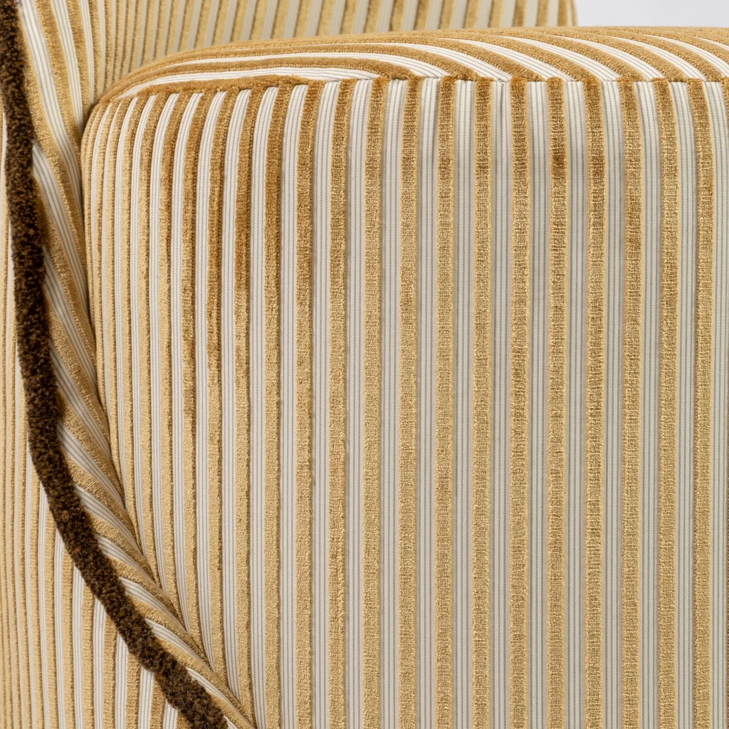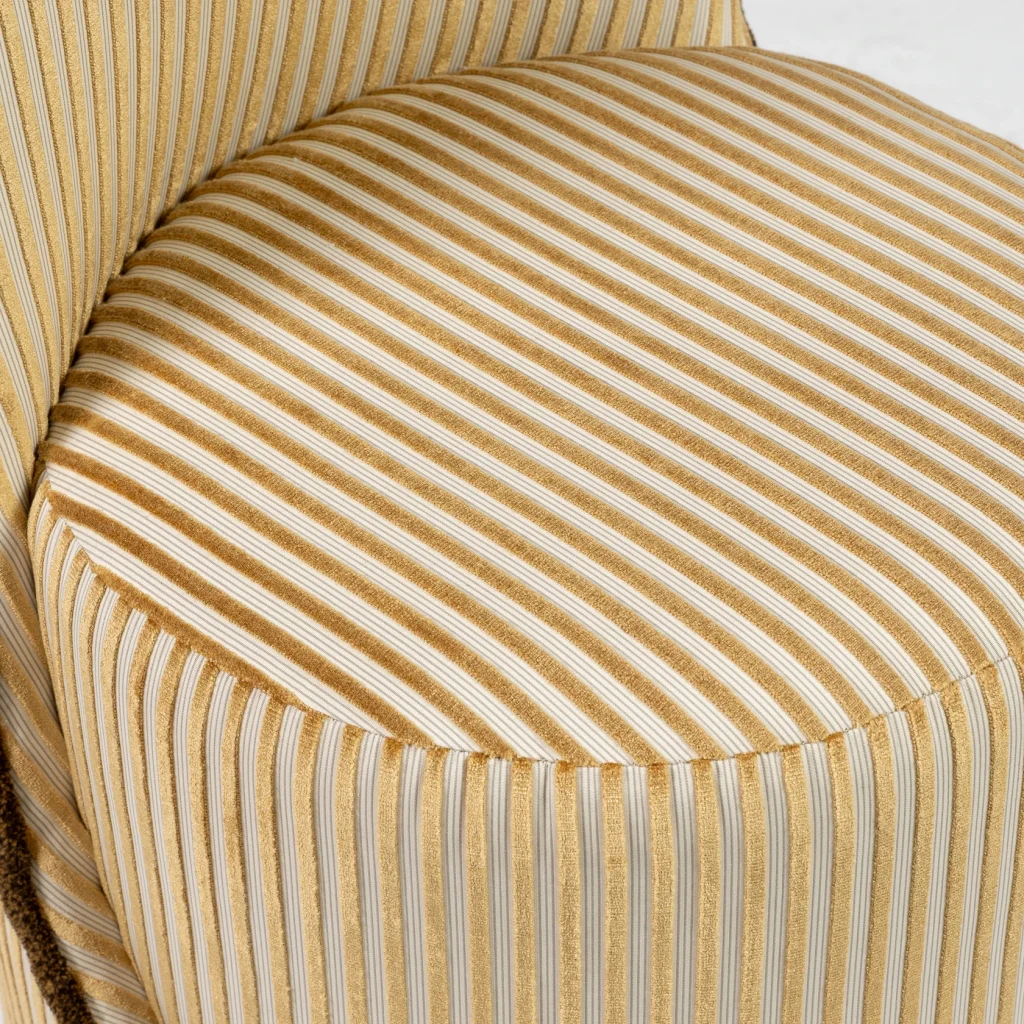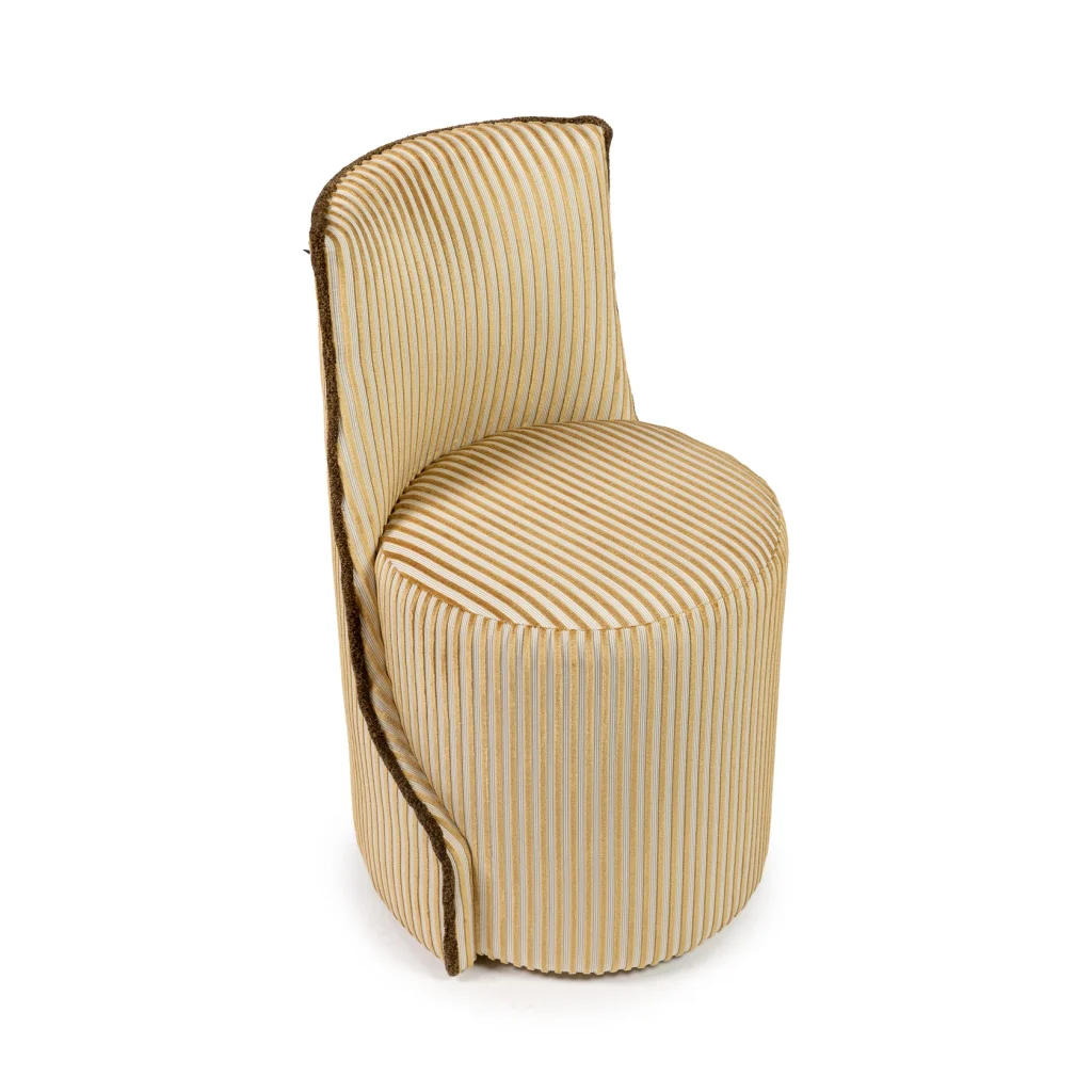 Meet Louis! Lou´s more masculine brother. Sculptural, playful, and effortlessly chic, this statement stool is a perfect blend of contemporary design and refined craftsmanship. Upholstered in an exclusive Nobilis fabric, the surface is brought to life with velvet stripes that add depth, rhythm, and a soft, luxurious texture. The elegant silhouette is further enhanced by a chenille piping along the sides, tracing the curves with a couture-like finish and creating a beautiful contrast against the striped velvet. This thoughtful detailing emphasizes the stool’s fluid form and gives it a distinctive, high-end character.