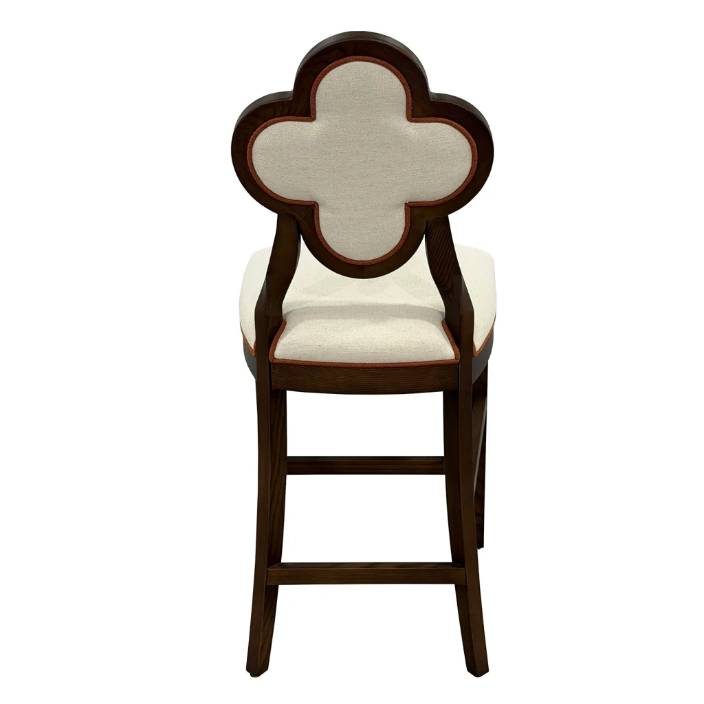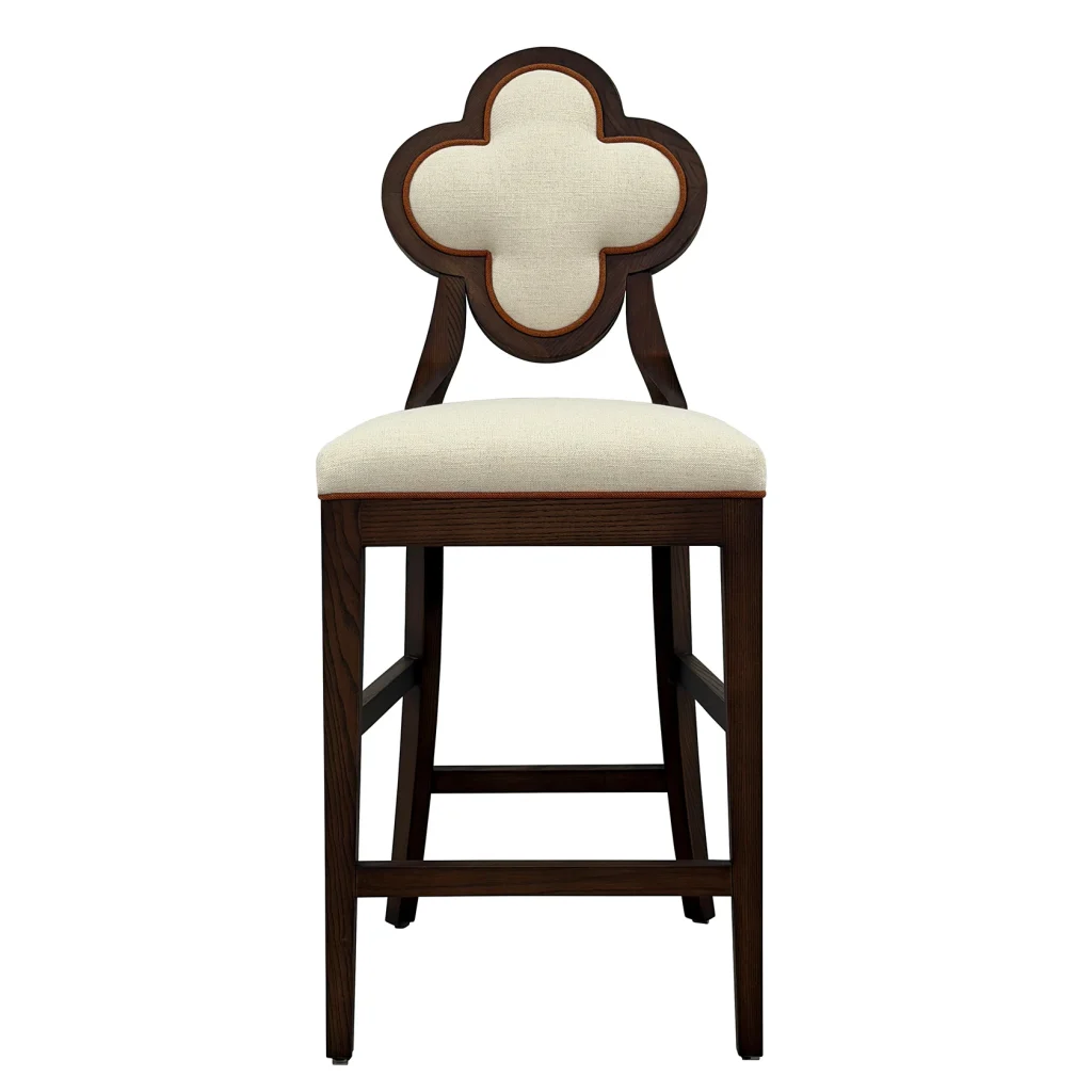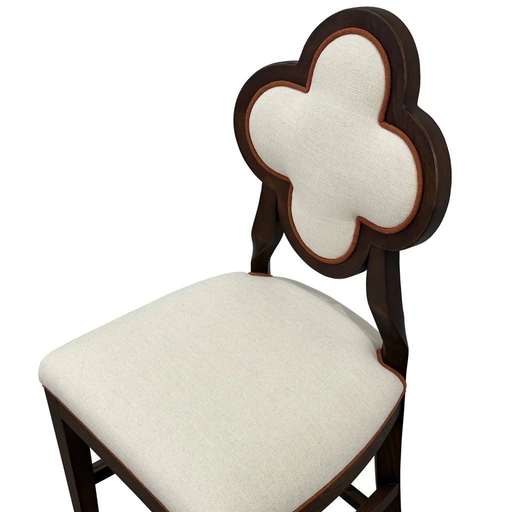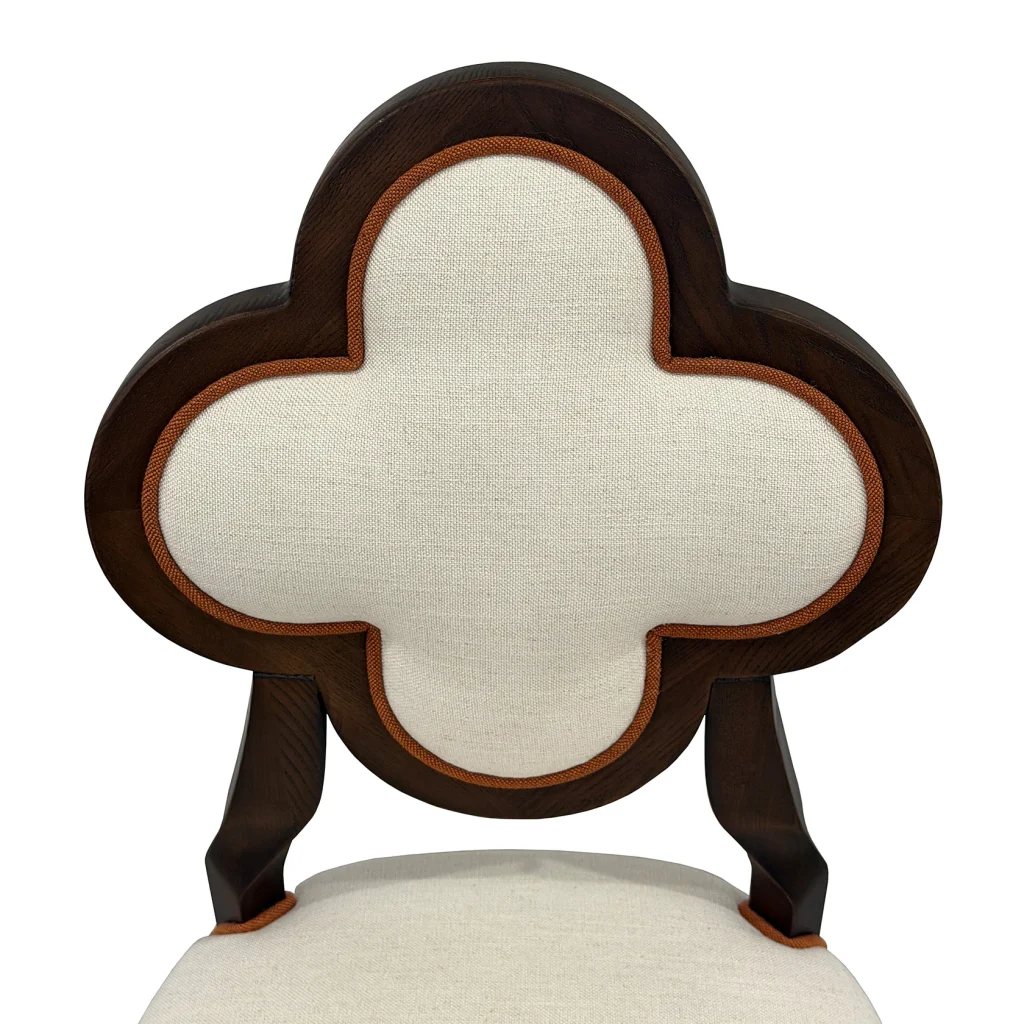 Meet Lucky, a chair that blends sculptural elegance and everyday comfort. This exquisite piece features a distinctive quatrefoil-shaped backrest, an architectural silhouette that instantly draws the eye. It is framed in rich, warm wood for a timeless, upscale look. The plush, linen-textured upholstery adds a soft, inviting touch, making it just as comfortable as it is beautiful.
