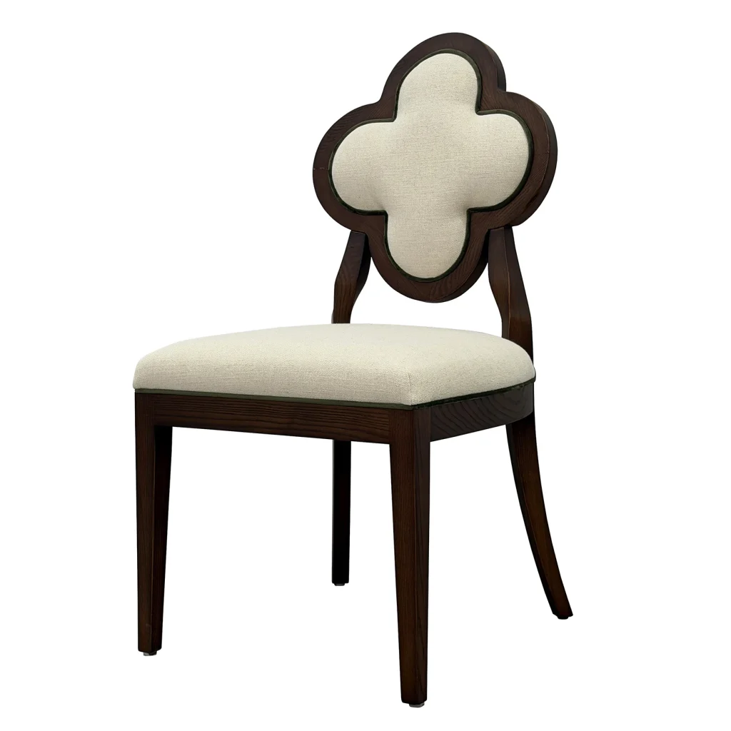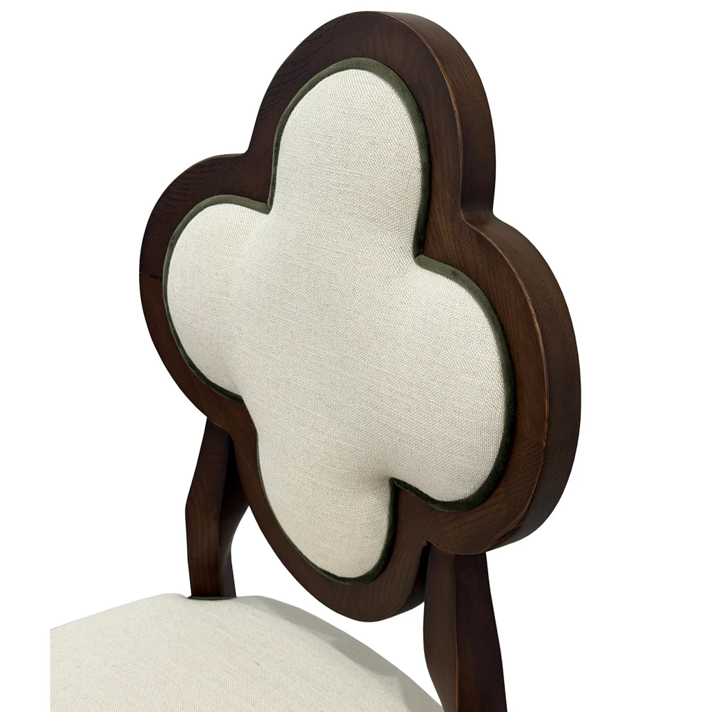 Meet Lucky, a chair that blends sculptural elegance and everyday comfort. This exquisite piece features a distinctive quatrefoil-shaped backrest, an architectural silhouette that instantly draws the eye. It is framed in rich, warm wood for a timeless, upscale look. The plush, linen-textured upholstery adds a soft, inviting touch, making it just as comfortable as it is beautiful.