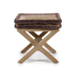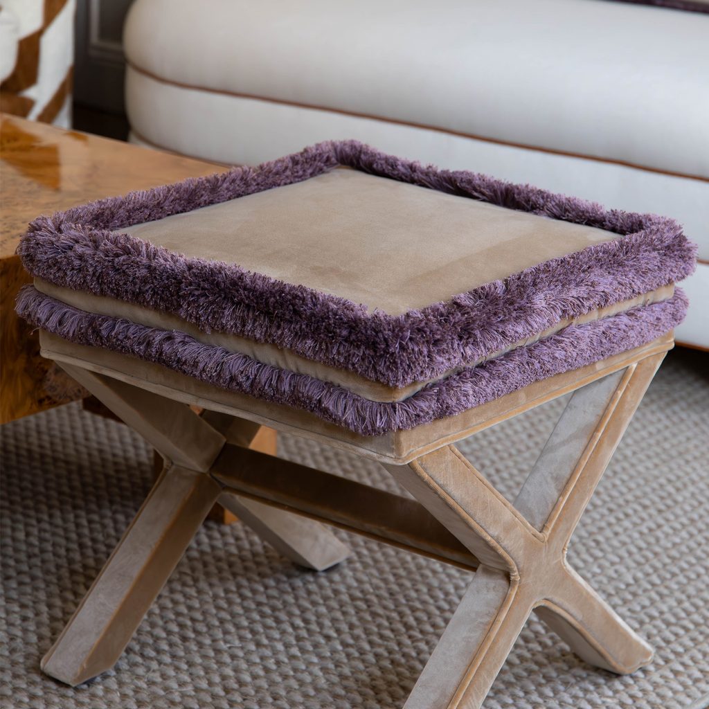 Marcel is an ode to the craftsmanship of upholstery. The detailing of the piping across the X shaped base, the double cushion with piping - everything comes down to perfection. We named this piece Marcel as we can see someone with that name tailoring a suit with a measuring tape around his neck in Paris or Milan. Add a coffee table book on top and use as side table. This extraordinary velvet item in beige velvet is like an art piece thanks to the luxurious purple brush fringe that goes around the top.