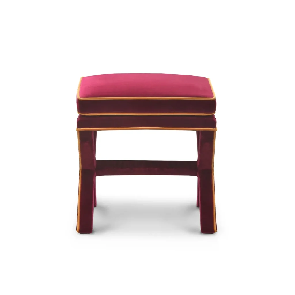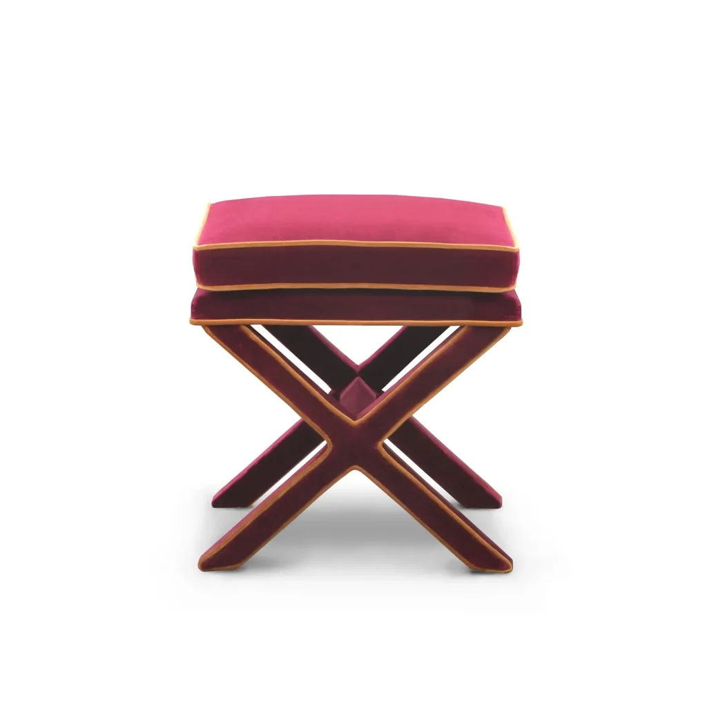 Marcel is an ode to the craftsmanship of upholstery. The detailing of the piping across the X shaped base, the double cushion with piping - everything comes down to perfection. We named this piece Marcel as we can see someone with that name tailoring a suit with a measuring tape around his neck in Paris or Milan. Add a coffee table book on top and use as side table. This velvet item in Burgundy has a contrast piping in Ochre color through-out the design and is meticulously manufactured by hand in Europe.