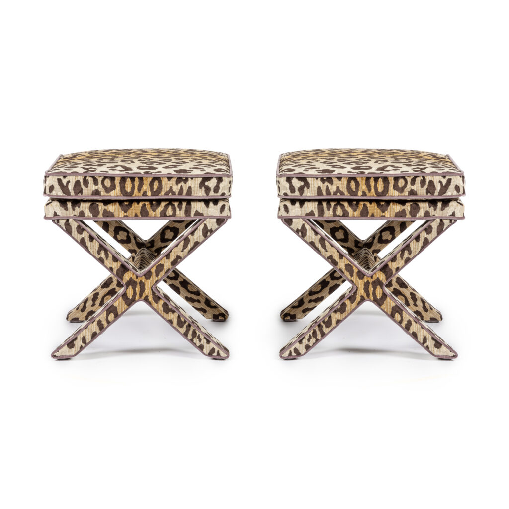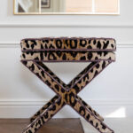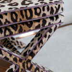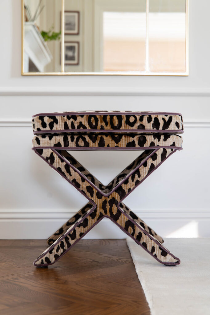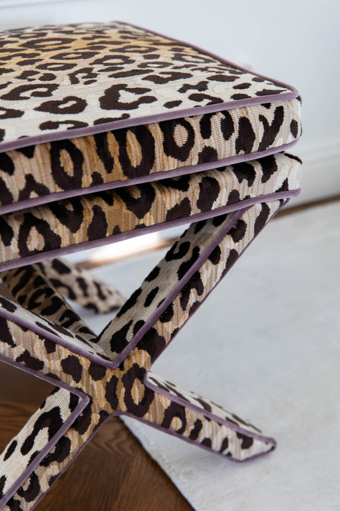 The fabric from ROMO with a bold leopard ombré embraces all that there is to love about leopard. This fabric is a union of sophistication and complexity, where épinglé velvet depicts a classic leopard spot with a twist. Layers of design and varying tonal shades give an illusion of movement, while an ombré ground creates a beautiful gradation of color and instils an animalistic likeness. This piece also has a fab contrast piping in purple velvet.