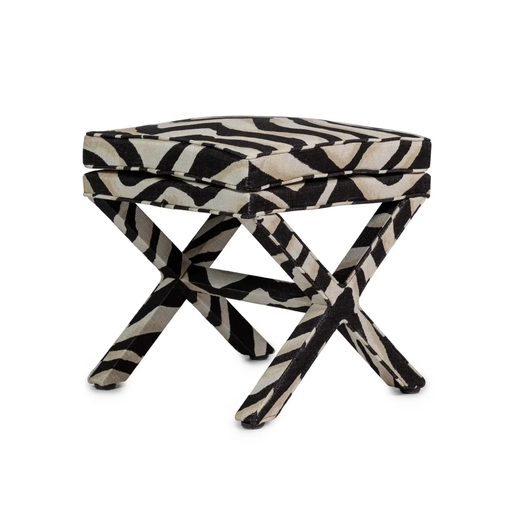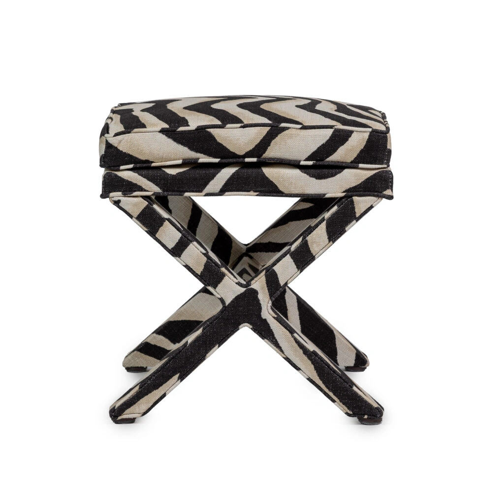 Marcel is an ode to the craftsmanship of upholstery. The detailing of the piping across the X shaped base, the double cushion with piping - everything comes down to perfection. We named this piece Marcel as we can see someone with that name tailoring a suit with a measuring tape around his neck in Paris or Milan. Add a coffee table book on top and use as side table. This version of Marcel is upholstered in a popular animal printed fabric from Ralph Lauren, and he looks indeed good in zebra stripes. Made in EU.