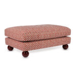 A foot stool, a pouf, an ottoman, a table? This camelion is lending itself to all occasions. We love how it can go from formal to informal easily with just styling. A fringe adds decadence, exposed legs some panache and a skirting feels very posh. Choice is yours. This Maxim is upholstered in the geometric, small scale print "Faye" fabric from Cathy Nordström. It is inspired by a 1950s pattern from one of Cathy’s many American textile and quilting books. The fabric together with the round wooden legs in color 'Sang de boeuf' make this ottoman a real knockout! Made in EU.