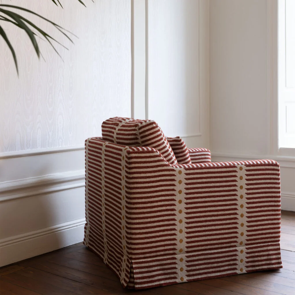 The lines follow it’s fellow namesake Orlando Sofa, with the curved armrests and the plush bolsters. It is big enough to be comfortable cur- ling up with a cup of tea, but nimble enough to allow for pairing in two. The foundation of the lounge chair is solid wood, upholstered in lus- hious fabric of choice. It can be adorned with fringes, trims and piping as well as staying just as it is. Each to their own. The thought is that the baseline of the design is so compelling that it works both with or without embellishments. We have created some of our own design favorites as we have a soft spot for prints and patterns.