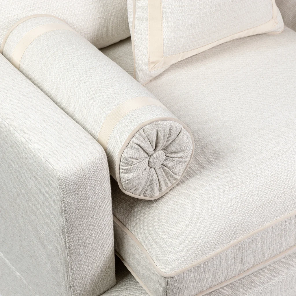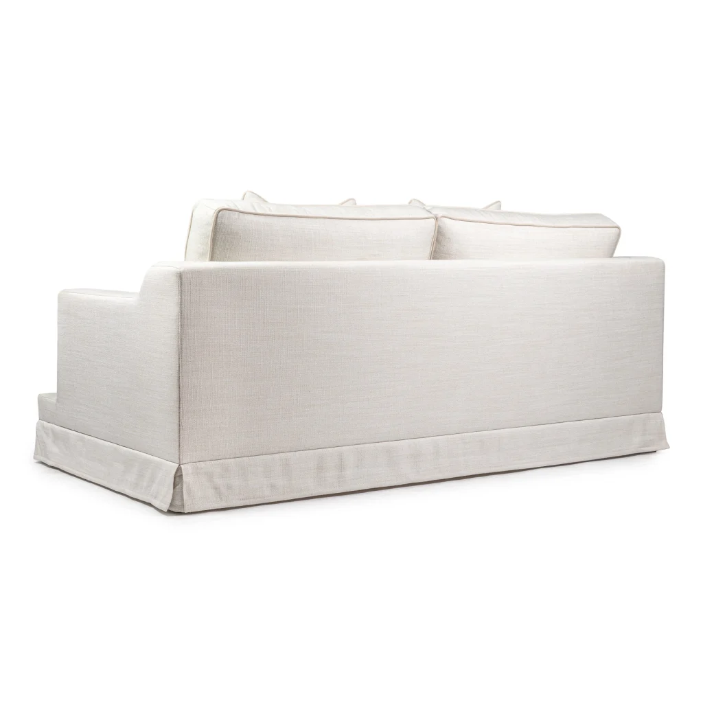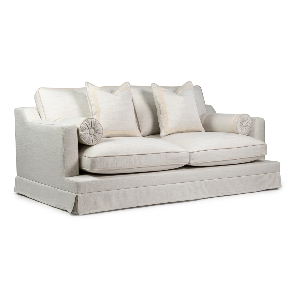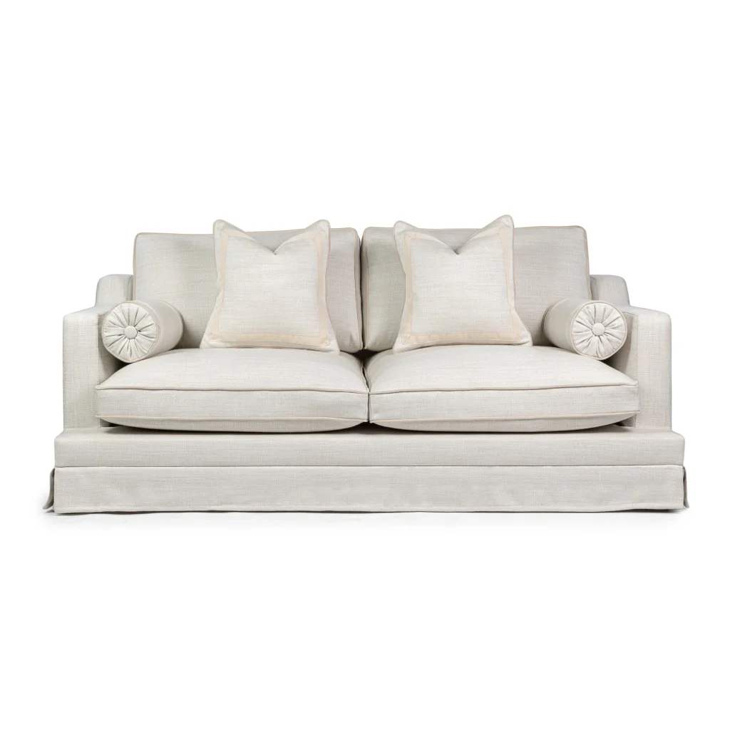 This elegant two-seater sofa is designed to bring relaxed sophistication into any living space. Upholstered in an easy-clean fabric with a cream colored piping and trims, it’s made for real life. The fabric handles spills, everyday use, and busy homes with ease, while still looking beautifully refined. The generously cushioned seats and supportive back pillows offer exceptional comfort, complemented by matching bolsters ande deco pillows that provide extra support and a touch of tailored detail. Finished with a classic skirted base, the sofa has a soft, timeless silhouette that works effortlessly in both modern and traditional interiors. Made in EU.