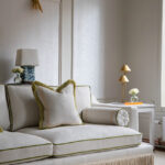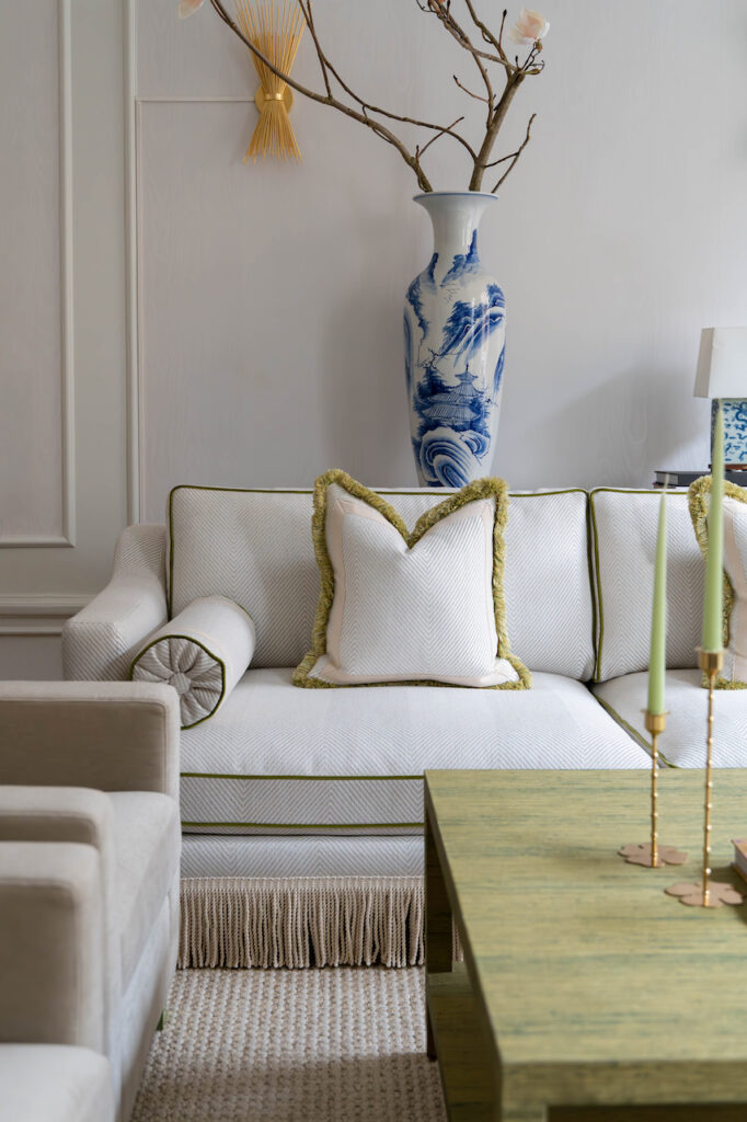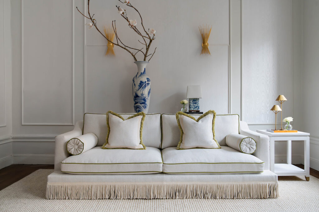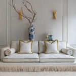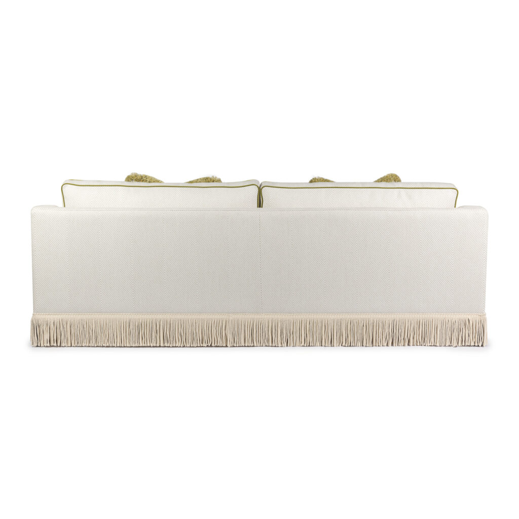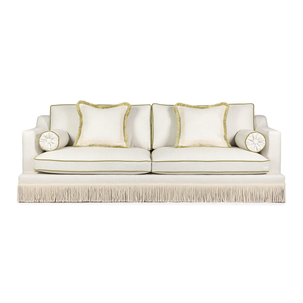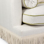 A luxurious statement piece reminiscent of old Hollywood Glamour with a modern take. This light colored sofa is upholstered in a fabric with a large fishbone pattern and is adorned with Ivory colored boullion fringes. The tulip-green velvet piping and the luxurious green fringes on the deco pillows make this sofa pop! The sofa has extraordinary seat comfort and is made in first class quality. Legs in solid wood. Made in Europe.