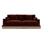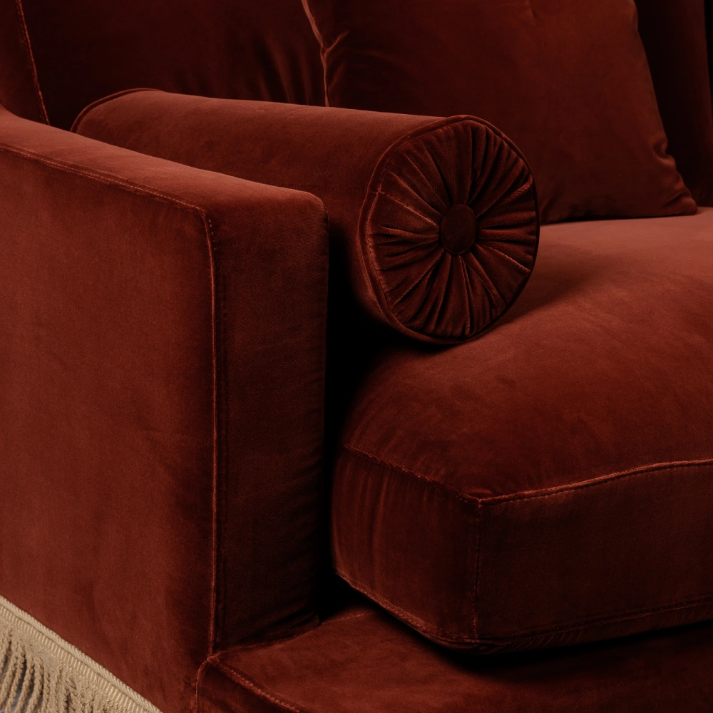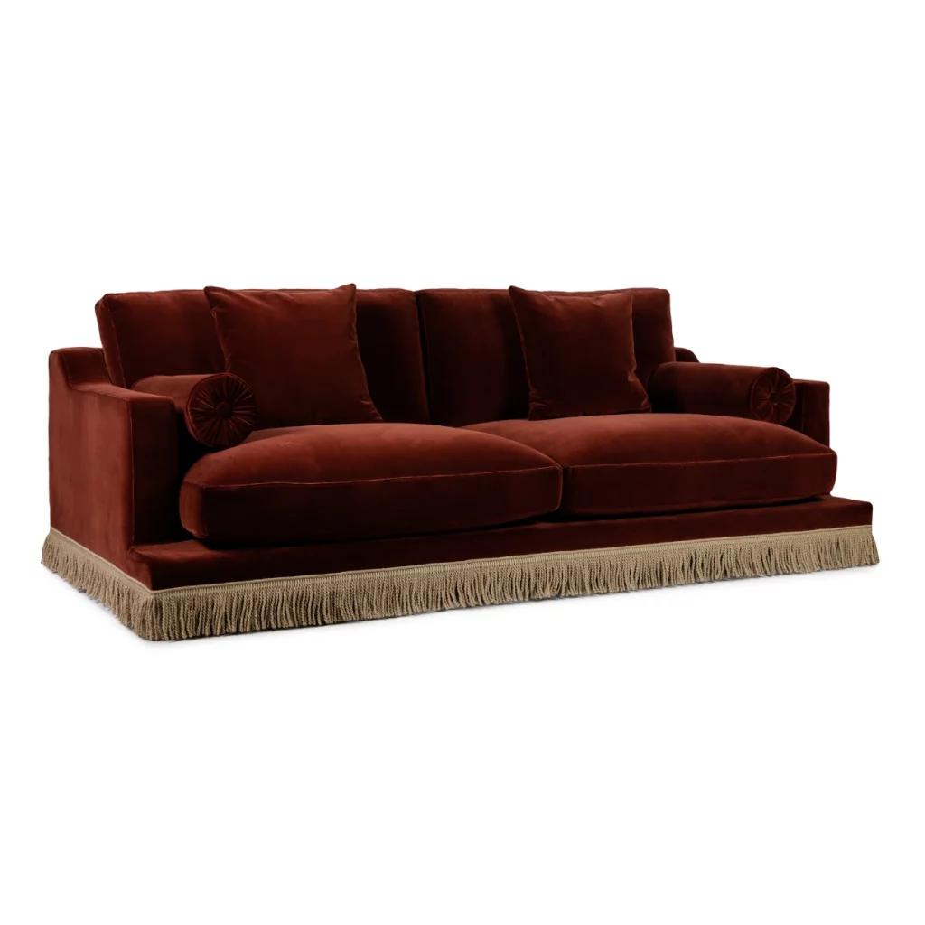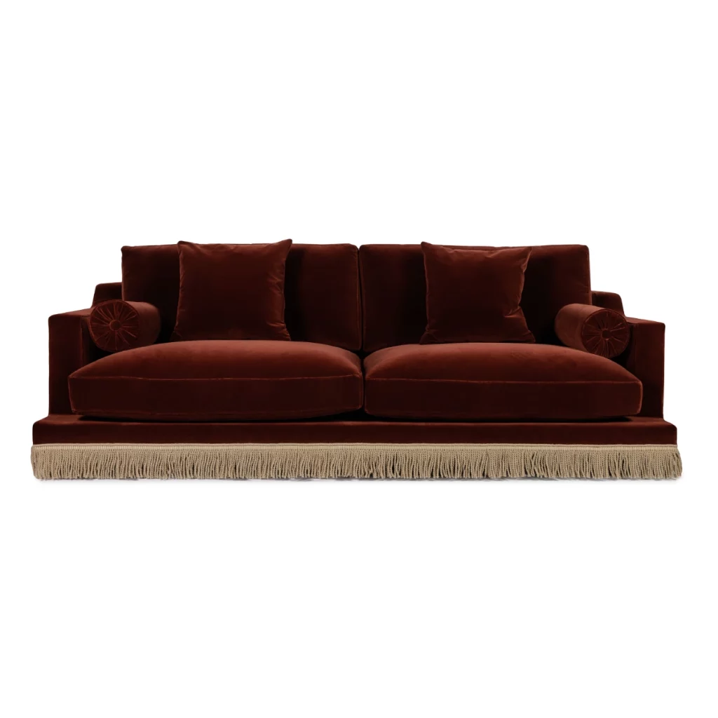 A luxurious statement piece reminicent of old Hollywood Glamour with a modern take. This rust colored velvet sofa comes with a luxurious beige Houlès fringe. The sofa has extraordinary seat comfort and is made in first class quality. Legs in solid wood. Made in EU.