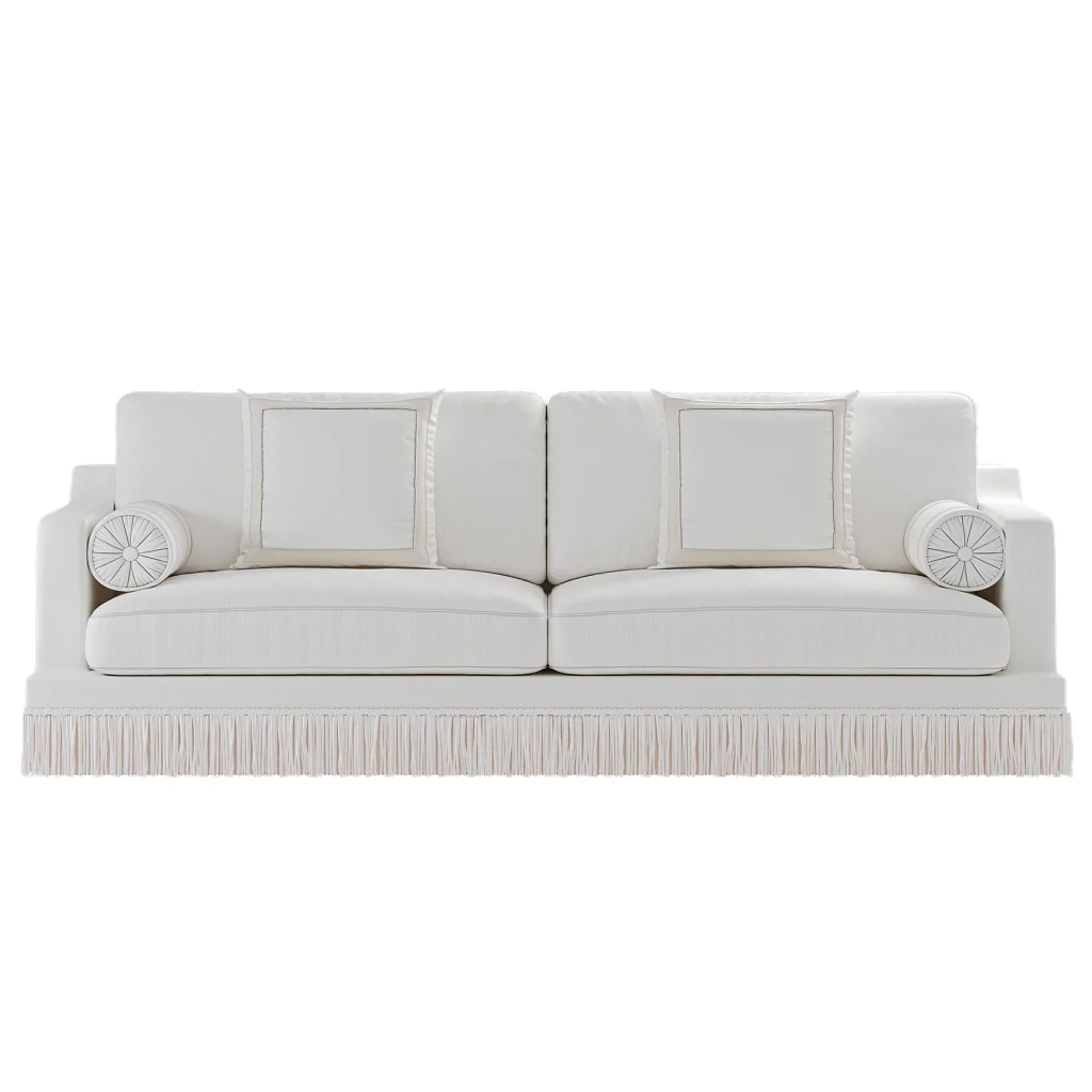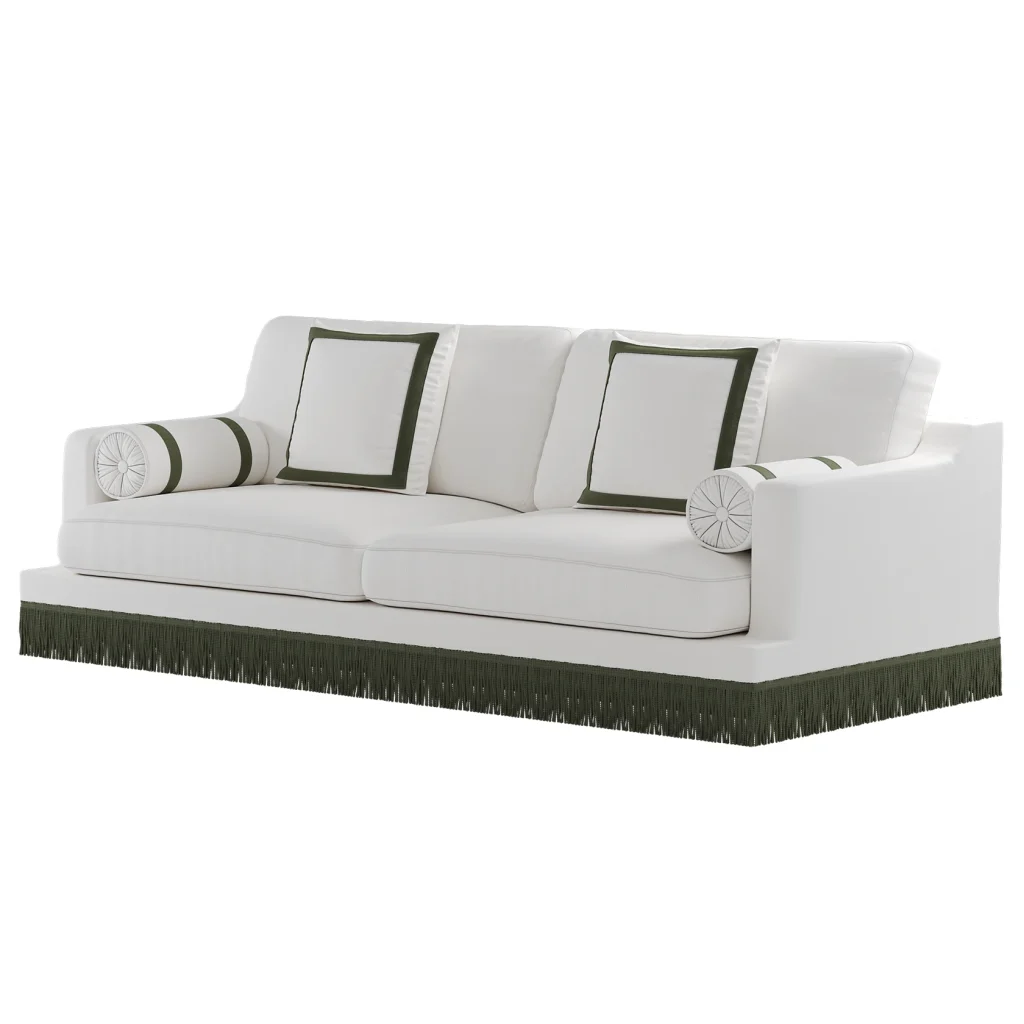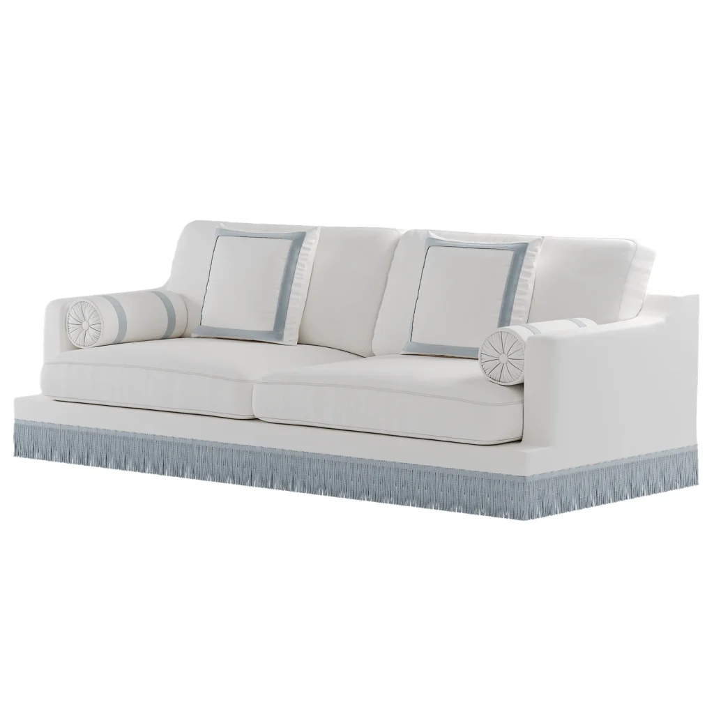 A luxurious statement piece reminiscent of old Hollywood Glamour with a modern take. Sofa with decorative pillows & side bolsters, extraordinary seat comfort and bullion fringes.