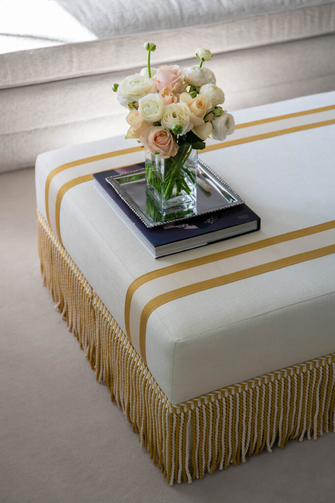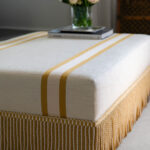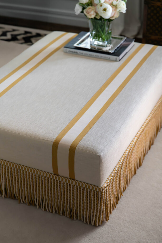 Pascal Ottoman; a perfect ottoman for extra seating or as a stylish coffee table. This piece is made in our Easy Linen fabric which combines the latest Stain-Free Technology with style and high-quality. This to ensure easy clean low maintenance, with a long lasting look and feel. We have dressed up this beautiful and crisp ottoman with tape and fringe from Samuel & Sons. Made in EU.